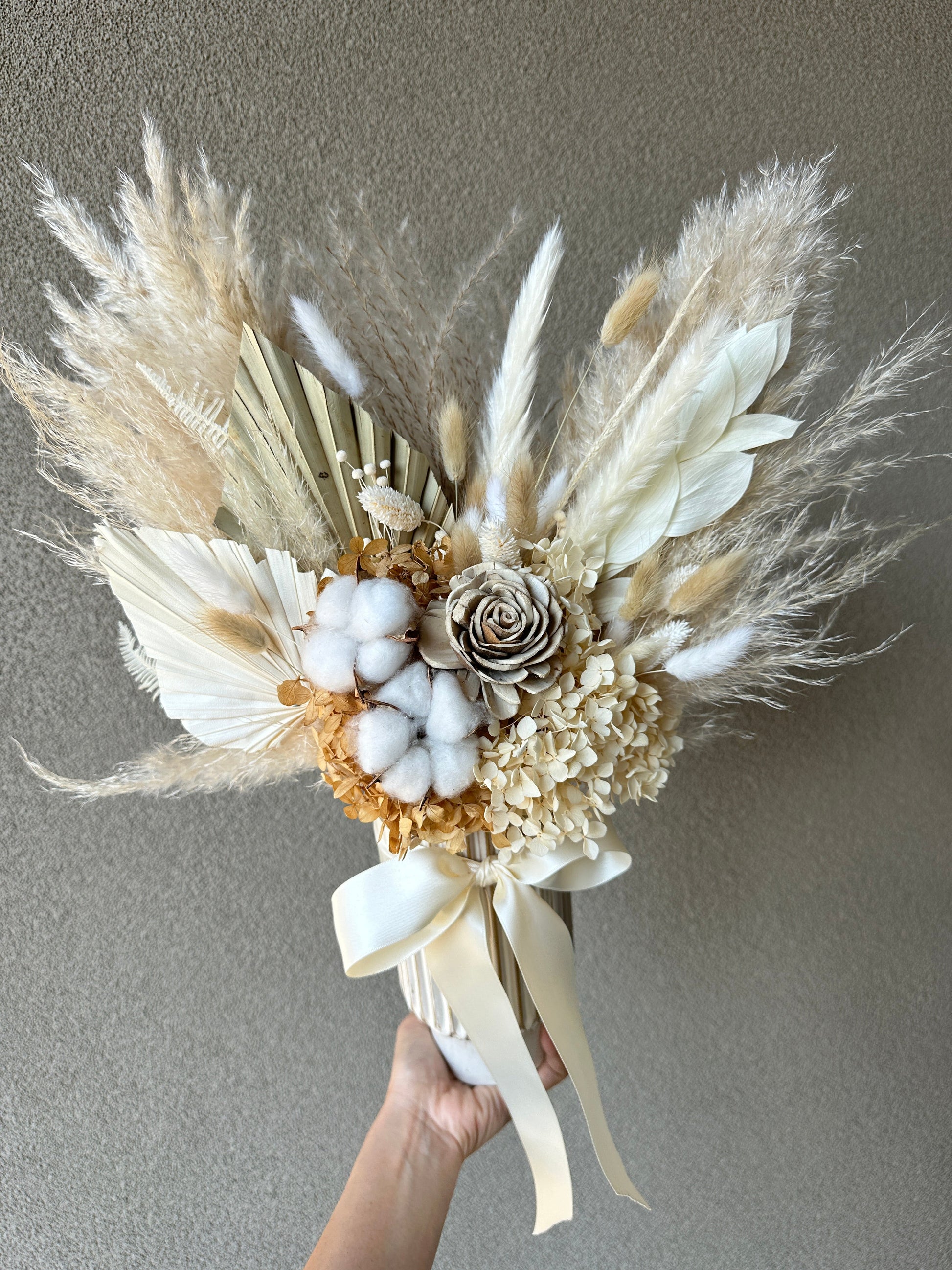 Perfect for adding a touch of elegance to any interior, this arrangement exudes a serene, minimalist vibe that complements modern, Japandi, and boho aesthetics. The natural hues of beige, cream, and white make it versatile for any setting, from living rooms to wedding decor.